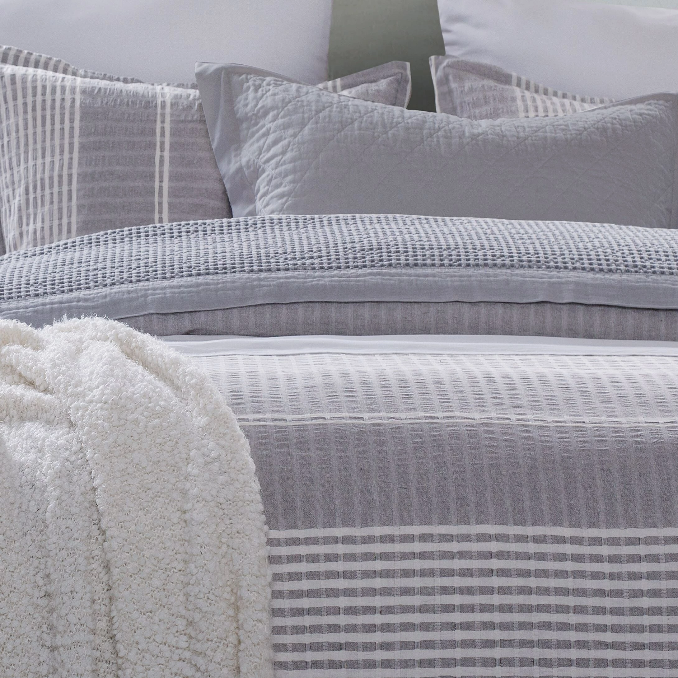 For a lovely, cottage look, the Lane Duvet Set sets the tone in cool grey. The woven striped material is linen like, creating a soft, light feel. It works handsomely as a vintage chic bed paired with linens and waffle weave, or a more classic bedding when accented with darker elements. The 3PC Lane Duvet Set creates a cozy, homey atmosphere for restful relaxation. Set measurment: King Duvet 110″ x 96″; King Shams: 21″x34″. Material: 100% Cotton. Care: Machine washable, cold, gently cycle. Only non-chlorine bleach when needed. Tumble dry low. Iron at lowest .