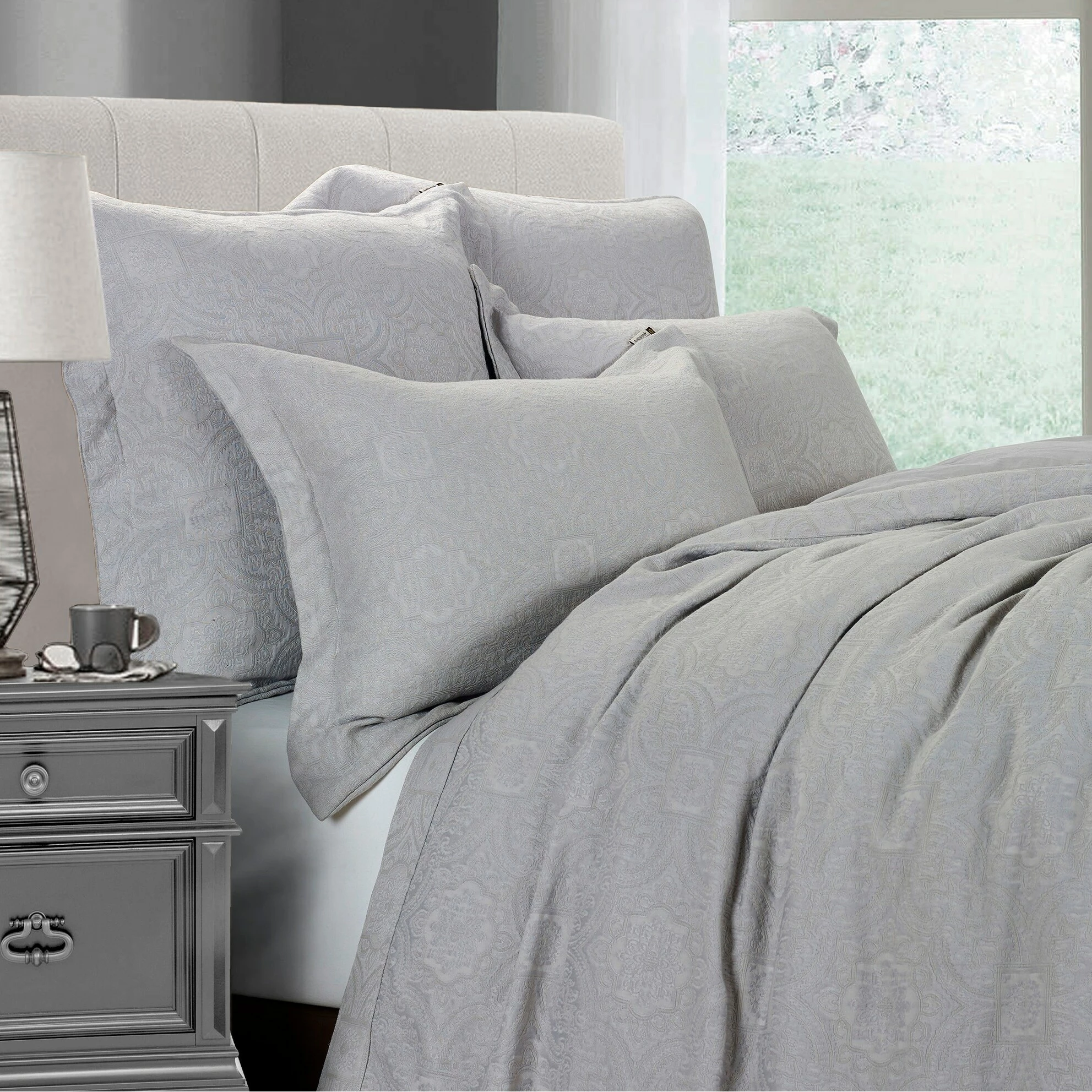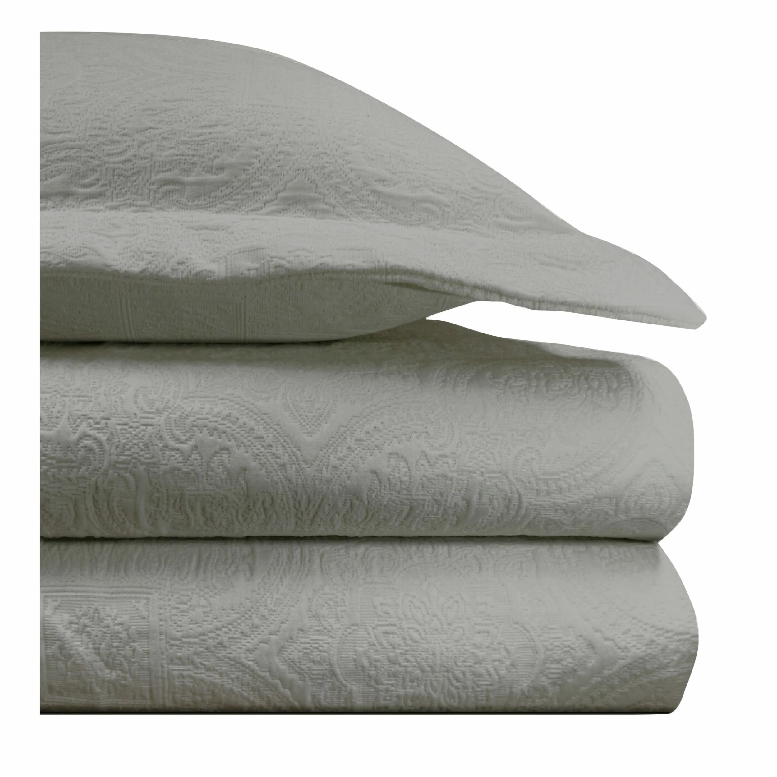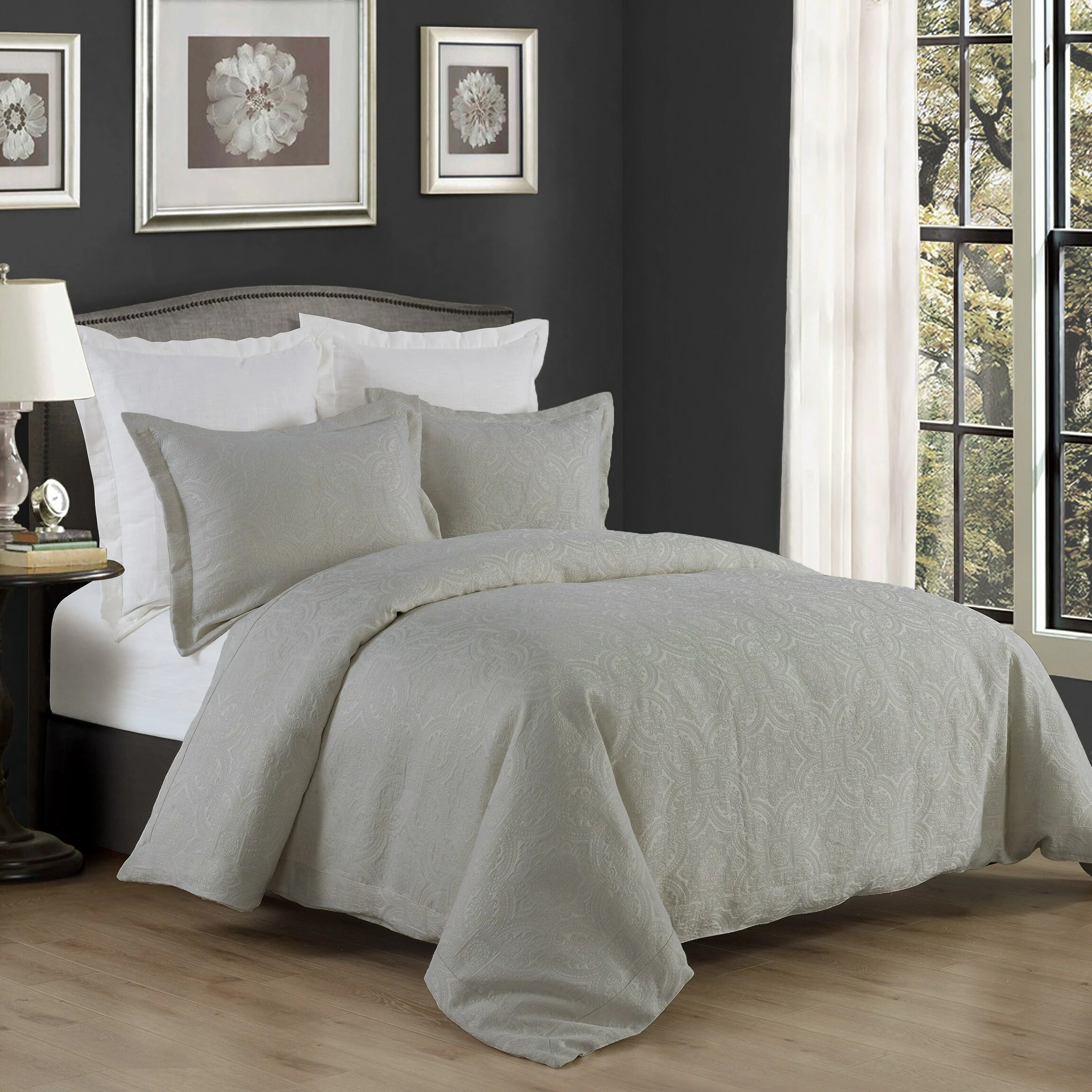Charming and sophisticated, this classic gray matelasse coverlet set is perfect for year round use. This coverlet is also a duvet cover. The lovely raised design of the matelasse pattern adds a truly elegant look to any room. Hidden zipper closure. Duvet insert sold separately. Imported. 3-PC Set Includes: (1) Coverlet, (2) Pillow ShamsMeasurement: Queen – Coverlet: 92″x96″, Sham: 21″x27″King – Coverlet: 110″x96″, Sham: 21″x34″Care: Machine wash cold, gentle cycle, use only non-chlorine bleach when needed, tumble dry low, iron on lowest setting if needed. For best results, dry clean only.Material: Coverlet: face: 68% cotton/32% polyester, back: 100% cotton.
