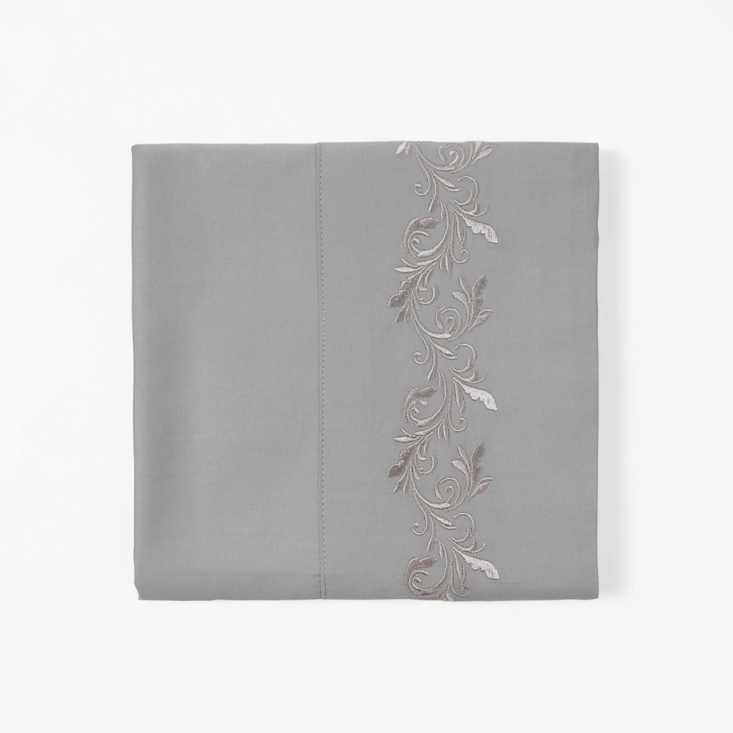 This set of silky sheets features a beautiful, intricate scroll embroidery for added elegance and sophistication for your bedding. The 350TC adds to a satin like softness for comfort and style. Elevate your sheets experience with this gorgeous four piece sheet set that will lend luxury and refinement to your bedding ensemble. Queen & king sheet sets are available in a crisp white w/ gray embroidery or silky gray w/ gray embroidery. 4-PC Set Includes: (1) Flat Sheet, (1) Fitted Sheet, (2) Pillowcases. Color Options: Gray w/ Gray Scroll. Measurement: Queen – Flat Sheet: 90″x102″, Fitted Sheet: 60″x80″ +18″, Pillowcase: 20″x40″ +5″. King – Flat Sheet: 102″x108″, Fitted Sheet: 78″x80″ +18″, Pillowcase: 20″x40″ +5″. Care: Machine wash cold, gentle cycle only, do not bleach. Tumble dry on low heat, iron on low heat. Do not dry clean. Material: 100% cotton. Imported.