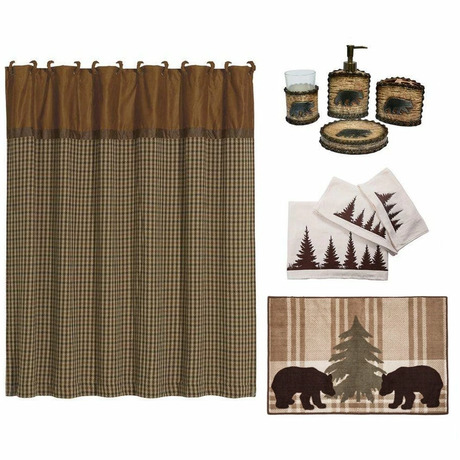 Add a rustic flair bathroom with this cohesive collection set. This Bear bathroom set provides you with handsome lodge inspired accessories that pull any bathroom together. Collection Includes: Crestwood/Clifton Shower Curtain, 72″x72″ 4 PC Bear Bath Set 3 PC Clearwater Pines Towel Set, Cream Bear Plaid Rug, 24″x36″