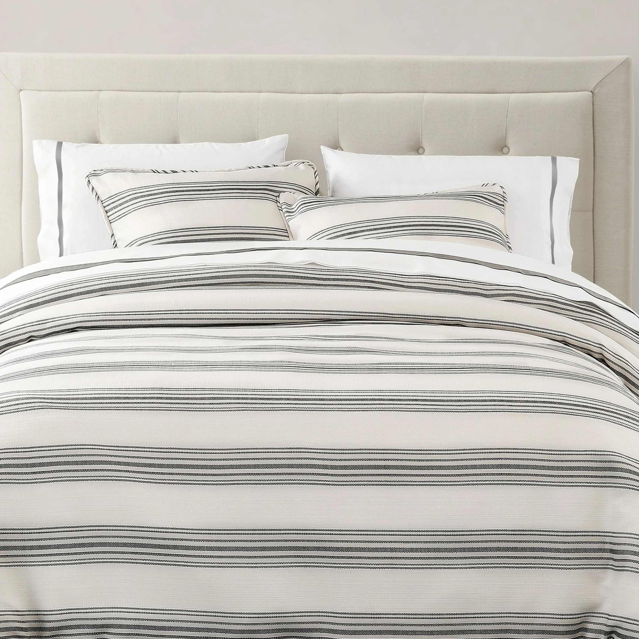 Create an inviting homestead with Blackberry, a comforter set with variegated black stripes against an ivory background, in a nod to traditional ticking fabric. For a farmhouse-chic look, pair it with white sheets and black and white accents. Give it a modern twist with a blanket and pillows in a bold hue. This three-piece set includes a lofty comforter and two tailored pillow shams with striped piping.