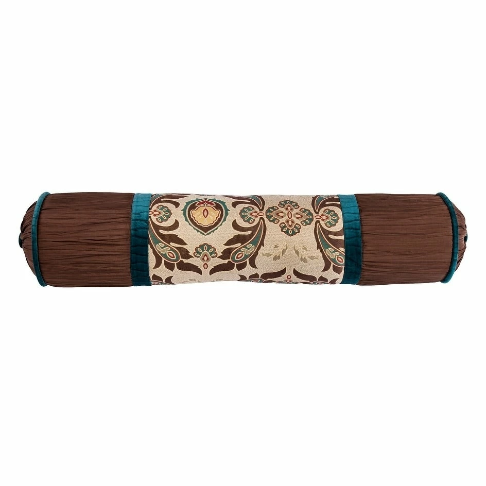 Elegant and refined, the Loretta collection makes a sophisticated statement. This large bolster pillow features a center panel of gold, teal, chocolate and red medallions surrounded with chocolate pleated taffeta and teal accents. Measures 36″ X 8″ Dia. Dry clean recommended. Spot clean recommended. Shell: 100% polyester, filling: 100% waterfowl feathers. Imported.
