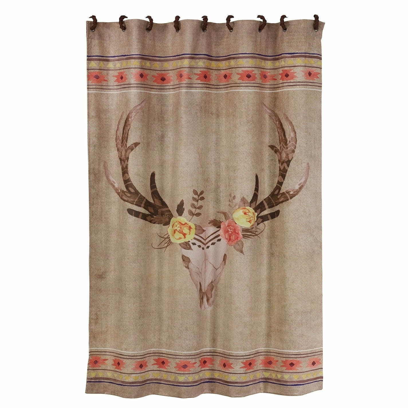 This gorgeous Desert Skull with Flowers Shower Curtain will showcase your love of the Southwest. Shower curtain measures 72″x72″ and includes 12 fabric covered shower curtain rings. 100% polyester construction. Dry clean recommended. Imported.
