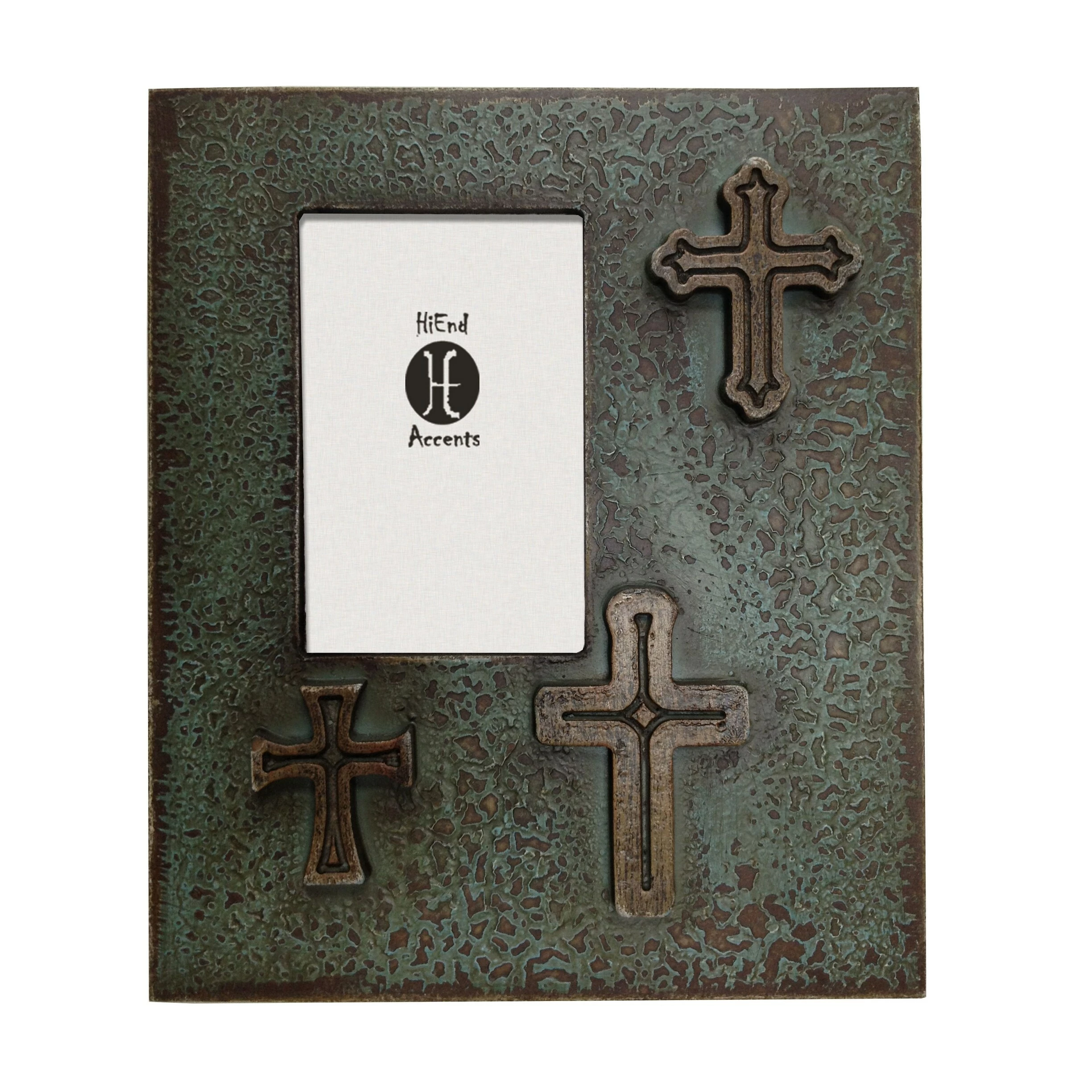 Add a bit of rustic to your home with the distressed turquoise photo frame, perfectly accented by a beautiful three cross design. Available in additional colors. For photographs measuring 4″ X 6″. Can be utilized with vertical photographs only. Back has swing tabs for easy installation, and a thick layer of glass protects your image. Measures 11″ X 9″.