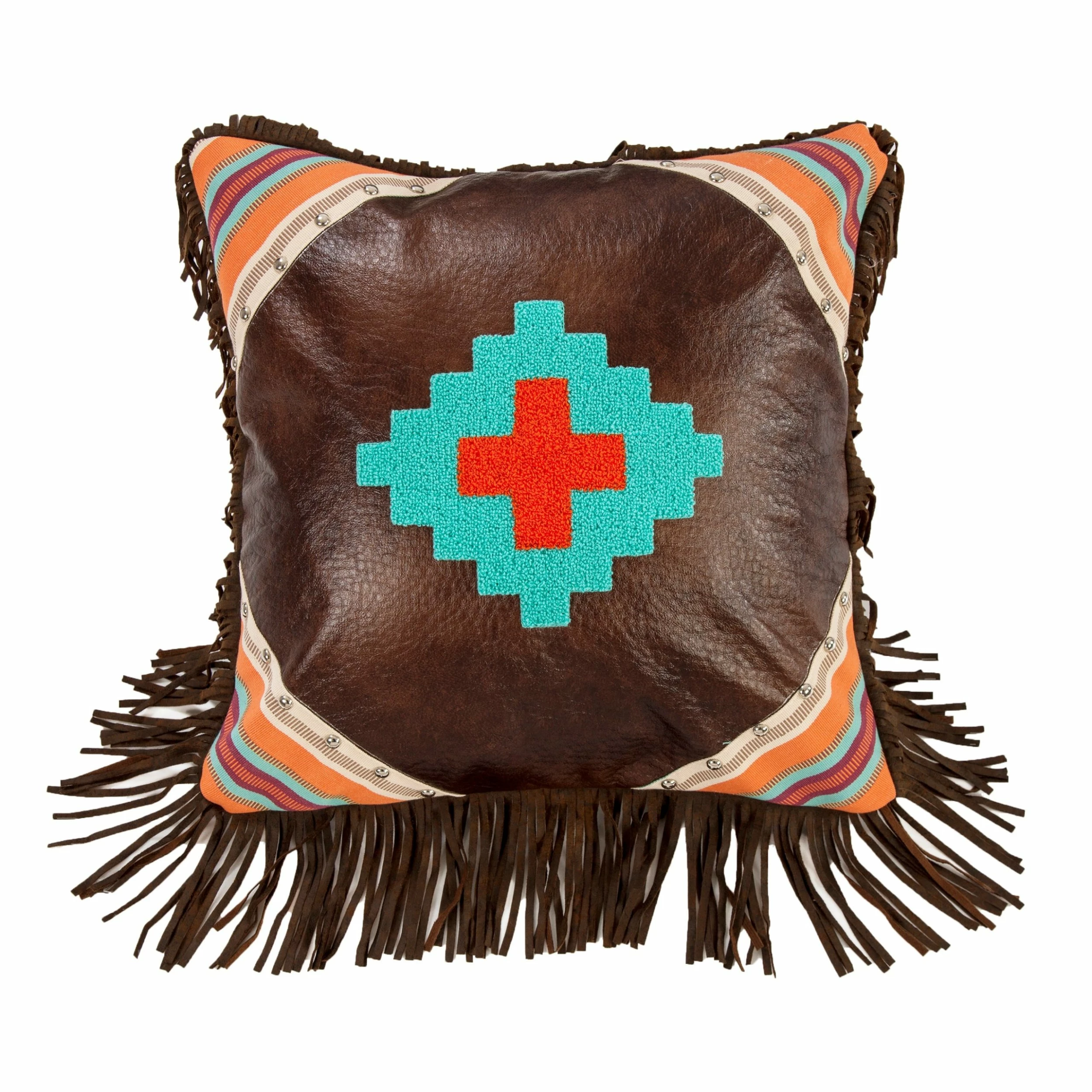 This charming faux leather pillow has detailed Aztec crewel embroidered center motif with Serape fabric corners and rounded silver studs. Measures 18″ X 18″. Studs are embedded into the fabric for durability, not glued. Hidden zipper closure. Spot clean recommended. Shell: 100% polyester, filling: 100% waterfowl feathers. Imported.