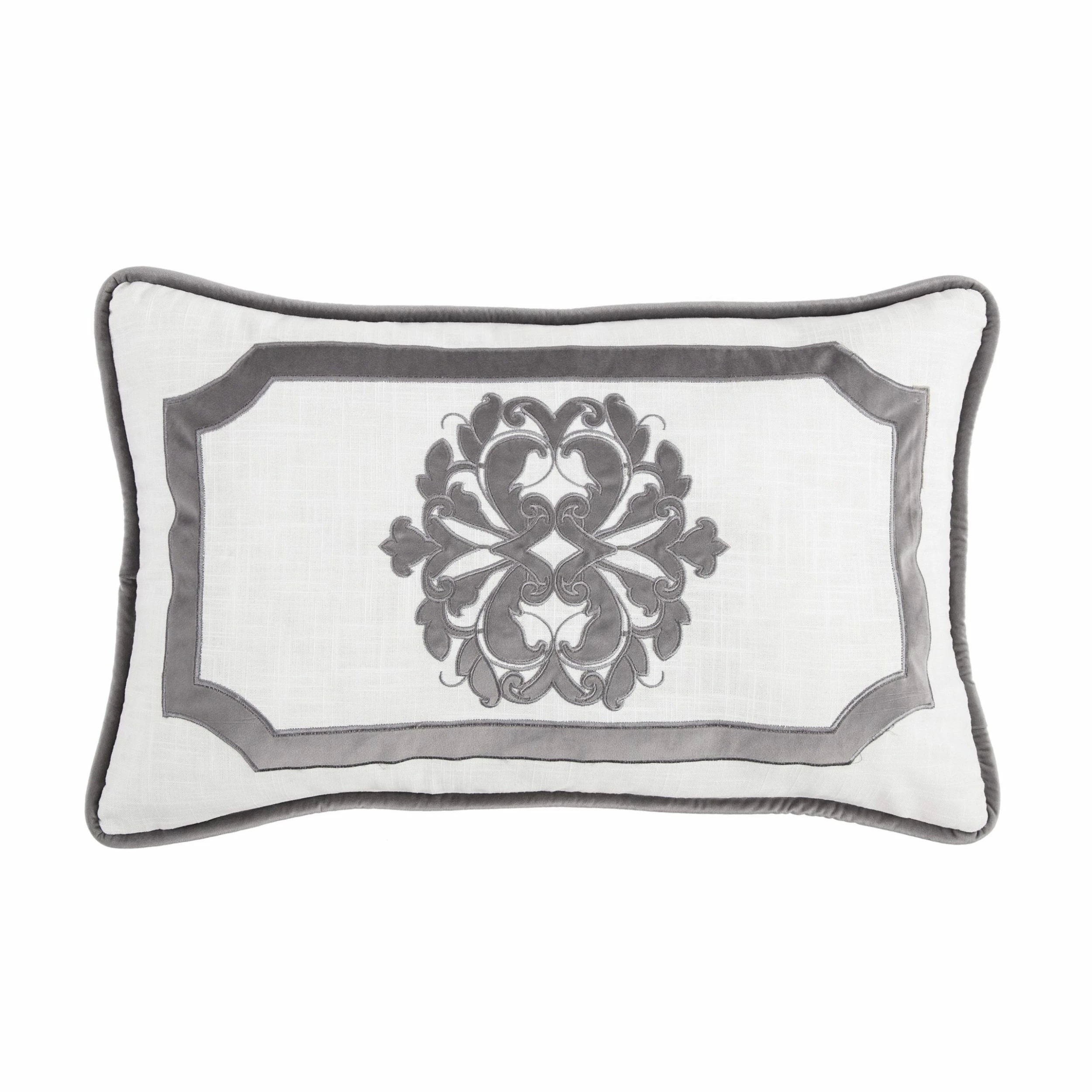 This oblong white linen pillow has a lovely gray regency velvet frame with center velvet applique. Measures 16″ X 26″. Hidden zipper closure. Dry clean recommended. 100% polyester. Imported.