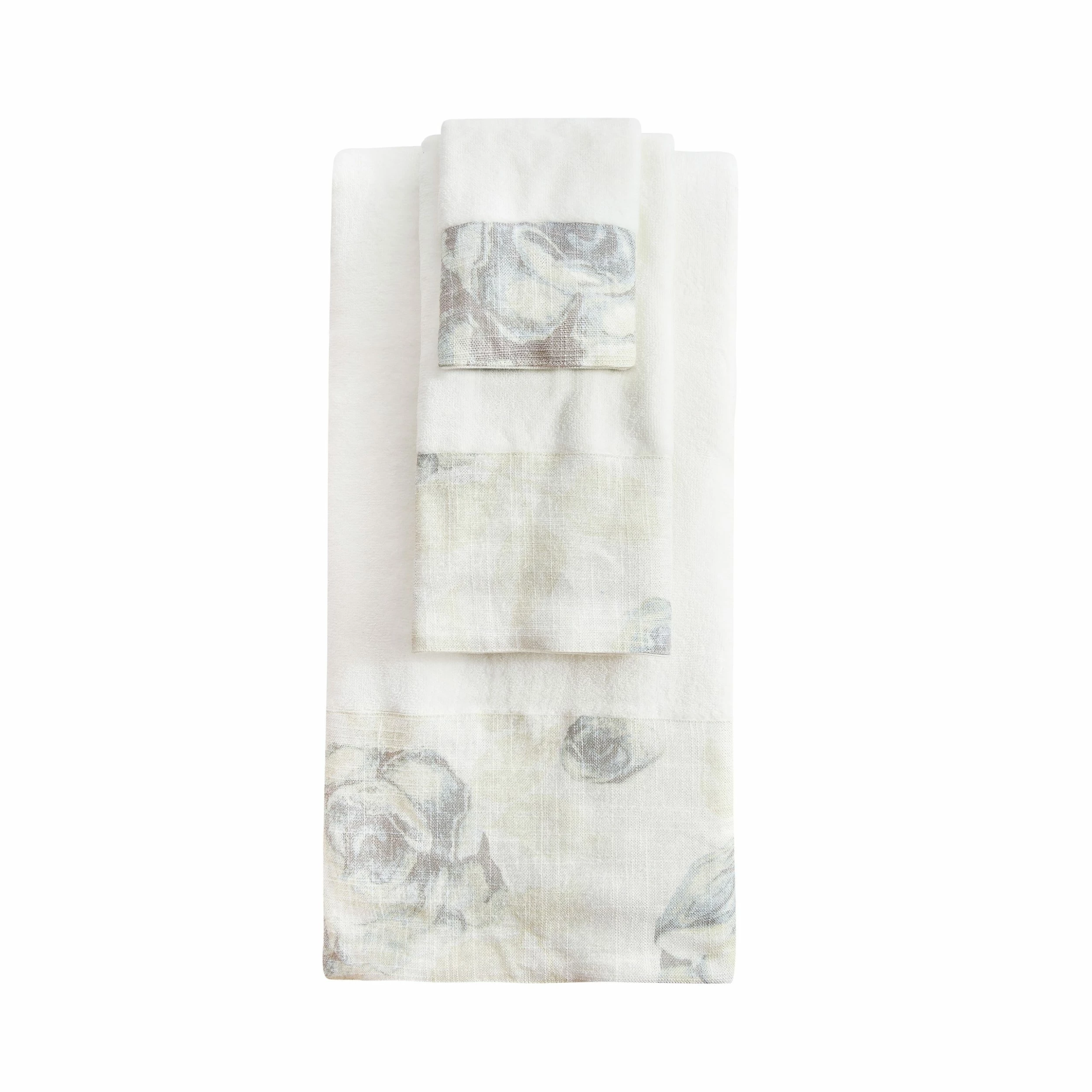 As a touch of elegance to your bathroom with the Rosaline Linen Towel Set. Featuring the gorgeous Rosaline floral print in linen on a pure white velvety velour, this set can be presented in a variety of layering options to make the look truly your own. Includes:Β (1) Bath Towel, (1) Hand Towel, (1) Finger Towel Color: White Measurement:Β Bath Towel – 27″x52″, Hand Towel – 16″x32″, Finger Towel – 13″x14″ Care: Machine wash warm. Tumble dry low or dry clean recommended. No bleach. Material: 95% Cotton, 5% Polyester