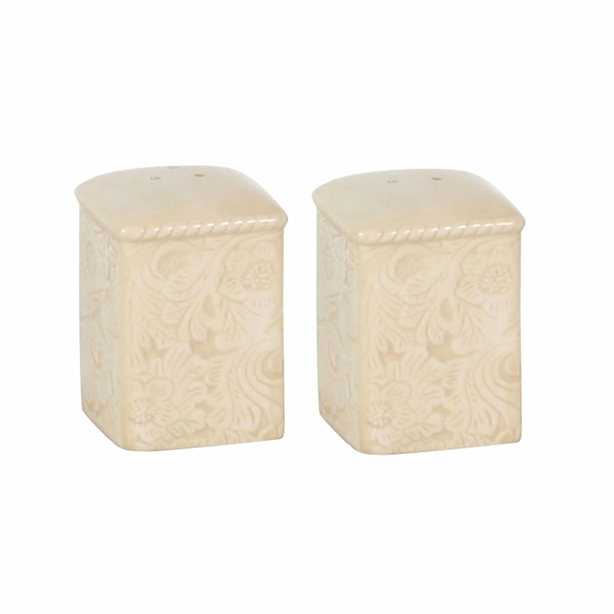 Add elegance to your table with this salt and pepper set from the Savannah collection, which features a swirling floral pattern with a damask flair. These striking pieces, designed to look like hand tooled leather are available in red, cream, taupe, turquoise and mustard.