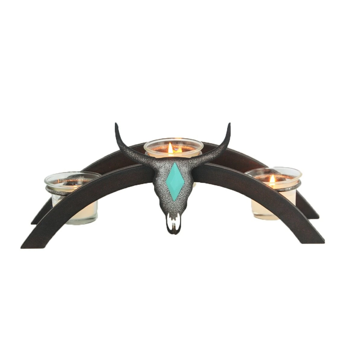 This Steer Skull Arched Metal Candle Holder with 3 Glass Votives will quickly become your favorite decorative piece. Can easily accommodate 3 votive candles. Steer skull decoration gives this piece a perfect southwest flair. Measures 12.2″x4.7″x5.5″. Made from steel and glass. Wipe clean. Imported. Votive candles not included.