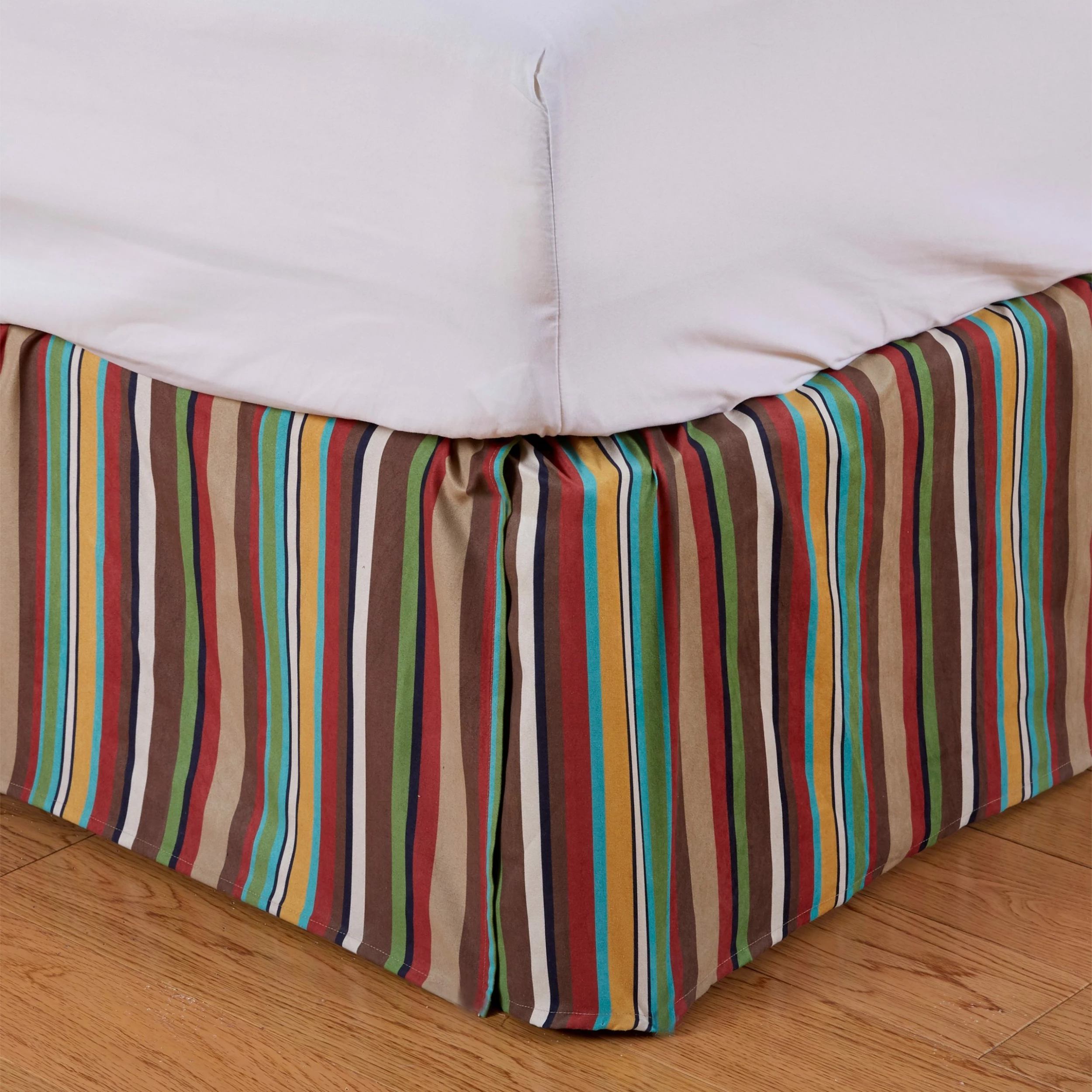 Balance out your bedding with this Tammy Striped Bed Skirt. The striped motif adds a more playful tone to the Tammy bedding while maintaining the warm western color palette. The addition of this bed skirt helps to bring to life your bedding with new brightness and pattern for a light, spirited accent. Color: Multicolor Stripe. Measurement: Twin: 39″ x 76″ + 16″. Full – 54″ x 76″ +16″ drop. Queen – 60″ x 80″ +18″ drop. King – 78″ x 80″ +18″ drop. Care: Dry clean only Material: 100% polyester. Imported.