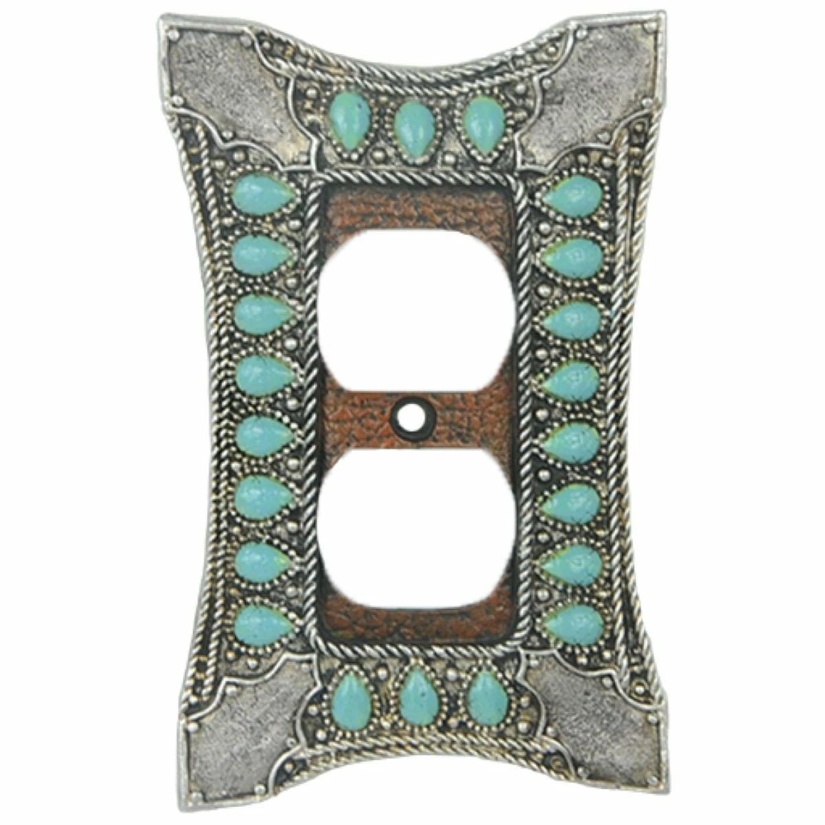Update your home with this gorgeous faux Turquoise and Silver Double Switch Plate. The switch plate captures a western spirit with the tear-shaped faux turquoise, rope detailing and antiqued faux silver elements.ย