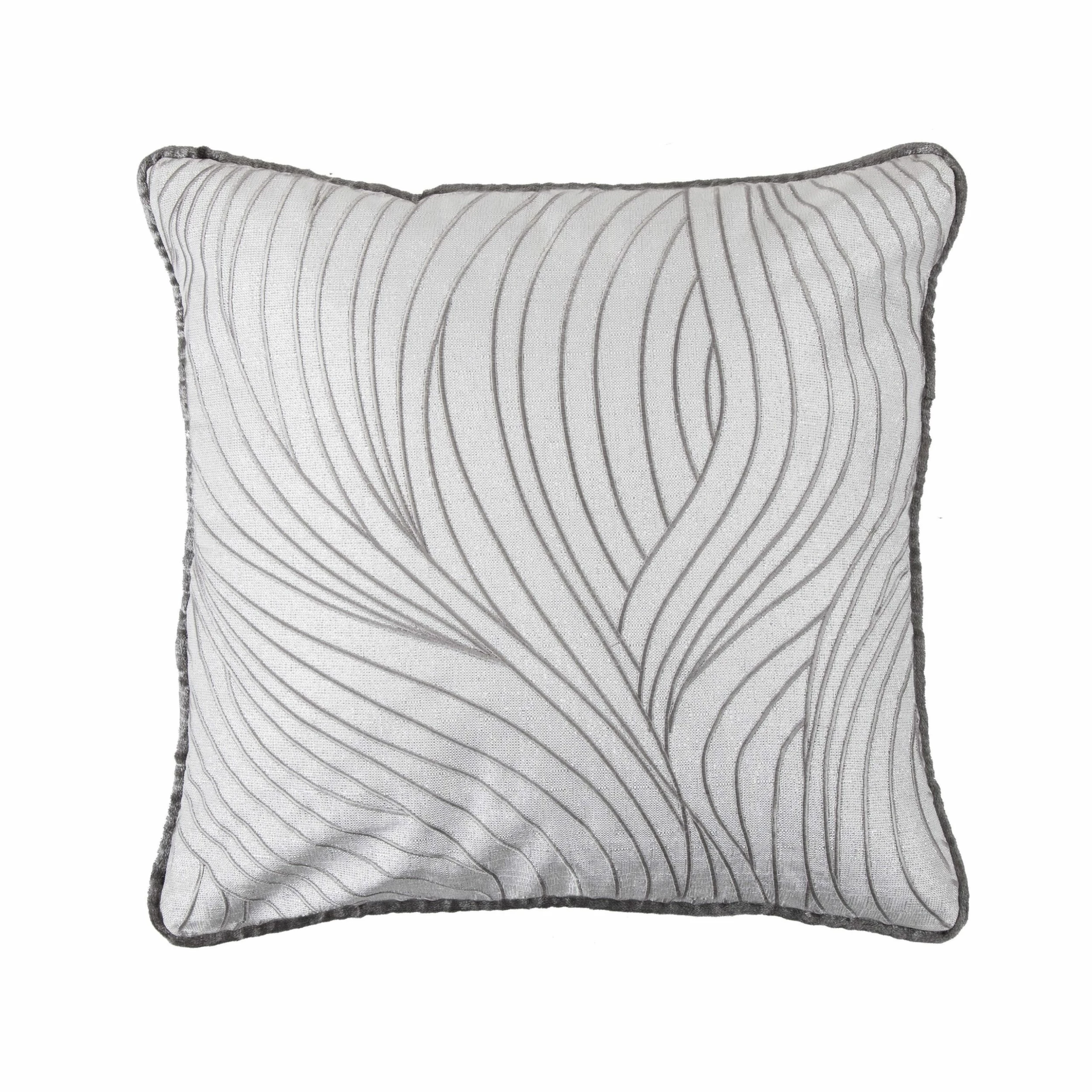 The gorgeous Celeste Wave Embroidery Pillow will add a modern elegant feel to your bedroom. The updated embroidered wave pattern gives this pillow a contemporary look. Embroidery is set on an exquisite shimmering silver fabric. Pillow reverses to soft velvet. Hidden zipper closure. Dimensions 18″x18″. Materials: Shell: 100% Polyester, Filling: 100% Waterfowl Feathers. Care: Spot Clean Recommended. Imported.
