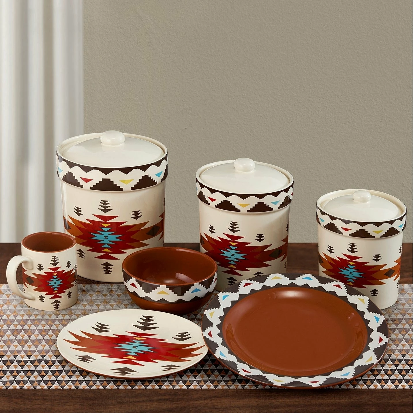 Give your traditional Southwestern dining ensemble a sophisticated modern twist with our Del Sol Aztec Dinnerware and Canister Set. Saturated jewel tones and neutrals come together in each piece, showcasing a stunning display of Aztec-inspired geometric patterns. Coordinate with our Del Sol Quilt Set, valance, pillows, and other items in the collection for a vibrant Southwestern home.